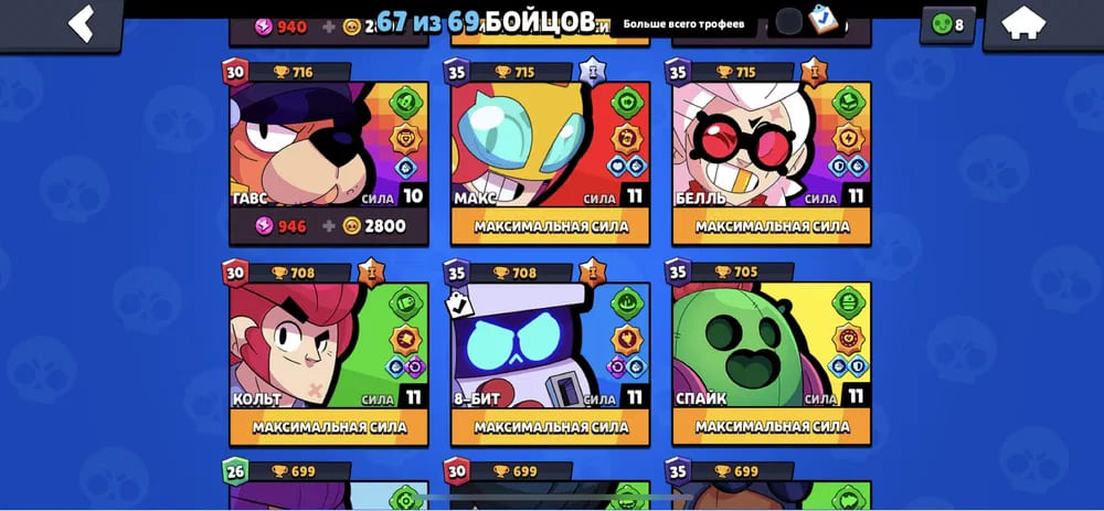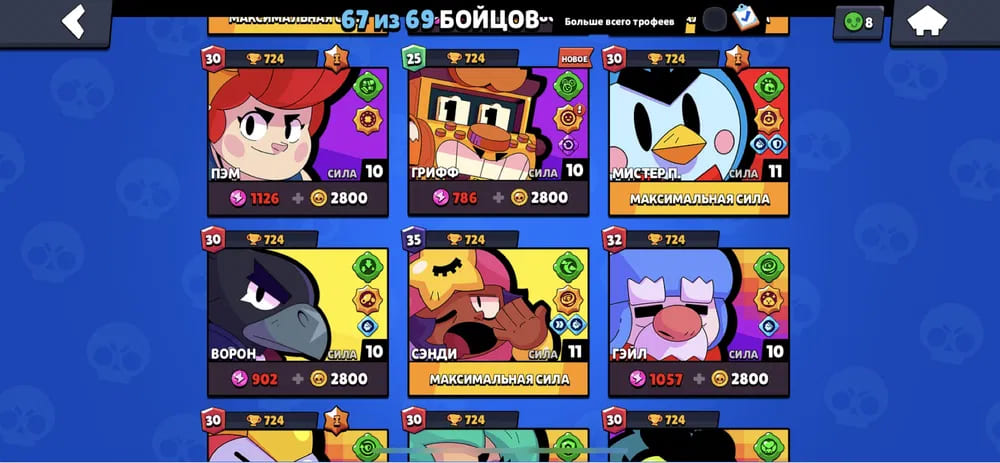 🏆Кубков: 30846; ⭐Уровень: 206; 💪Бойцов: 56/72; ⚡Леги: Леон, Спайк, Амбер, Ворон, Сэнди, Мег;
