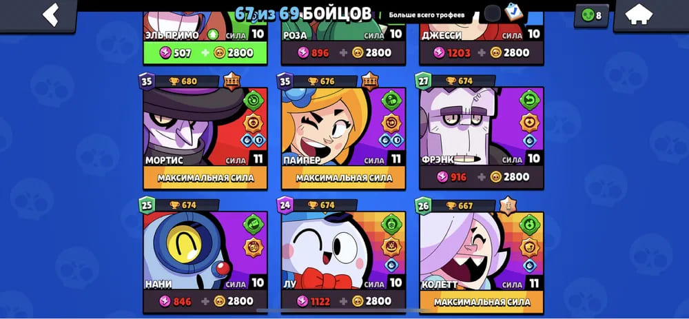 🏆Кубков: 29399; ⭐Уровень: 243; 💪Бойцов: 53/72; ⚡Леги: Леон, Спайк, Амбер, Ворон, Сэнди, Мег;