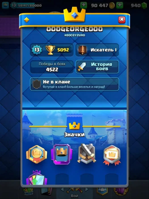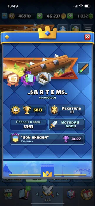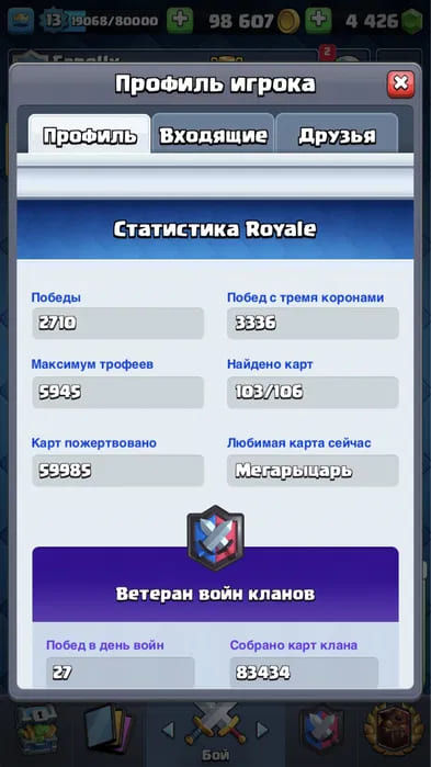 🃏Карты: 104/107; ⚡Легендарные карты: 18/18; 🏆Кубки: 5813;
