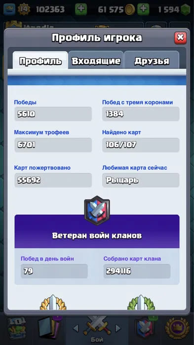 🃏Карты: 102/107; ⚡Легендарные карты: 16/18; 🏆Кубки: 5092;