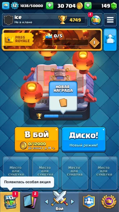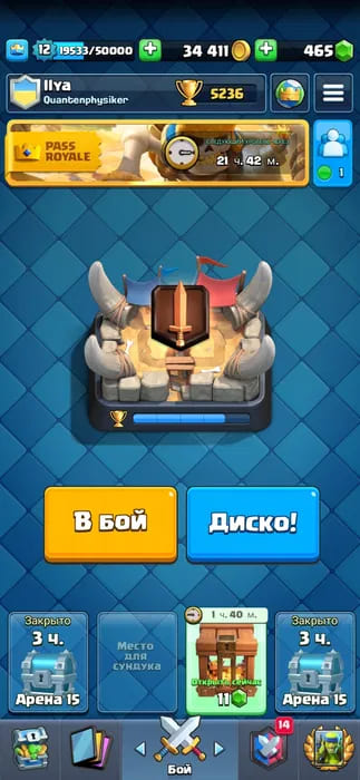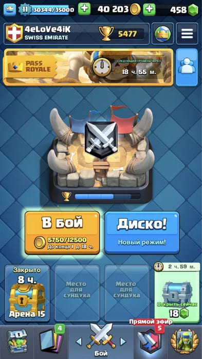🚩Арена: 14; 🃏Карты: 99/107; ⚡Легендарные карты: 14/18;