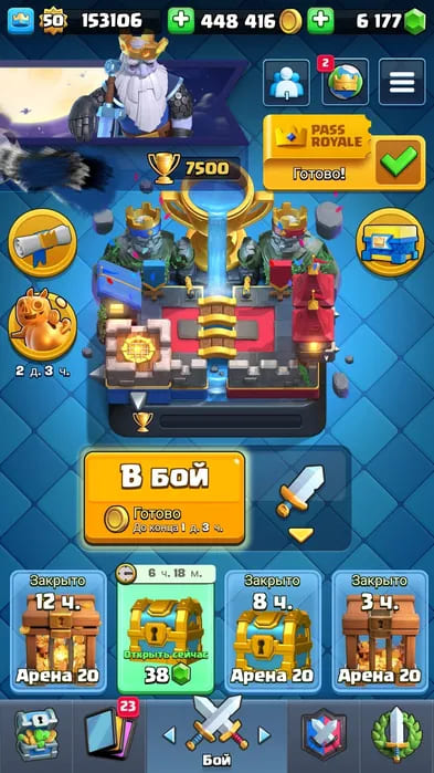 🚩Арена: 15; 🃏Карты: 104/107; ⚡Легендарные карты: 18/18;