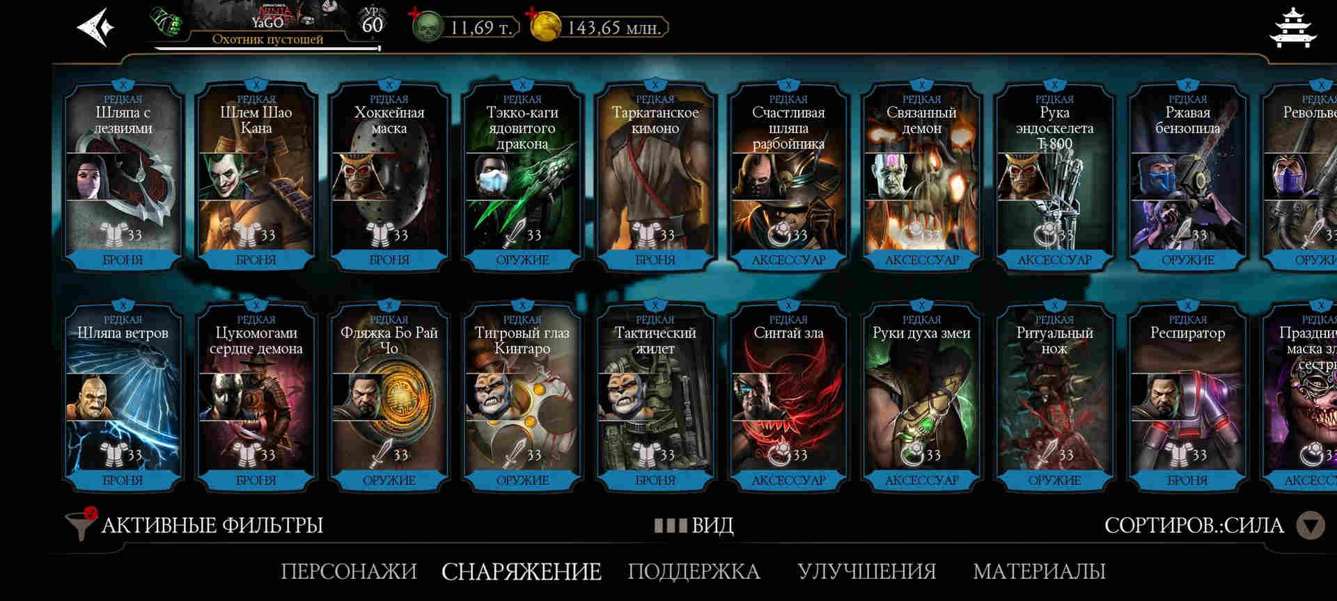 ⚡Практически все бруталити. Все френдшипи. Правктически все эпики из башен, редкое башенное - много на Х, все остальное редкое - на Х. Есть маска Драмина на Х лвл. 102 очков талантов.
