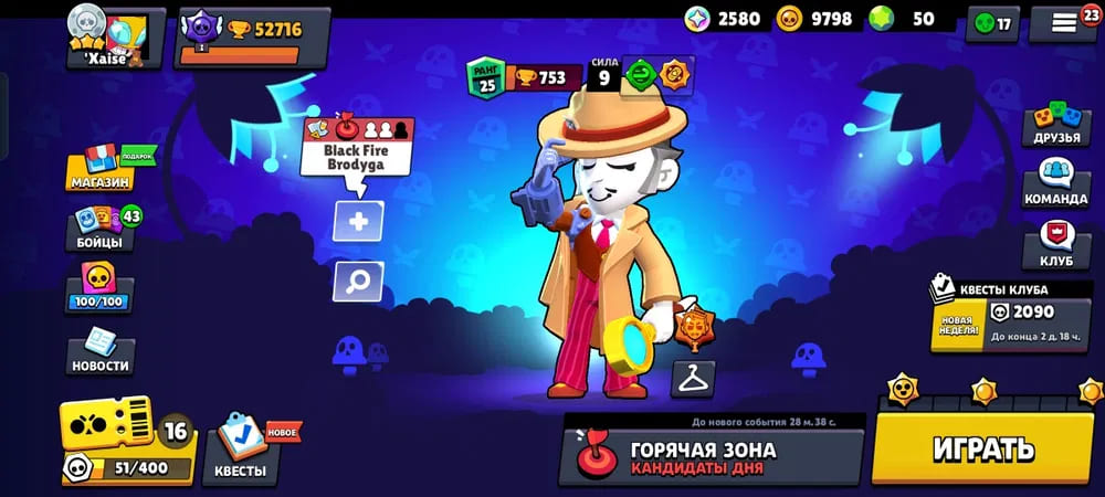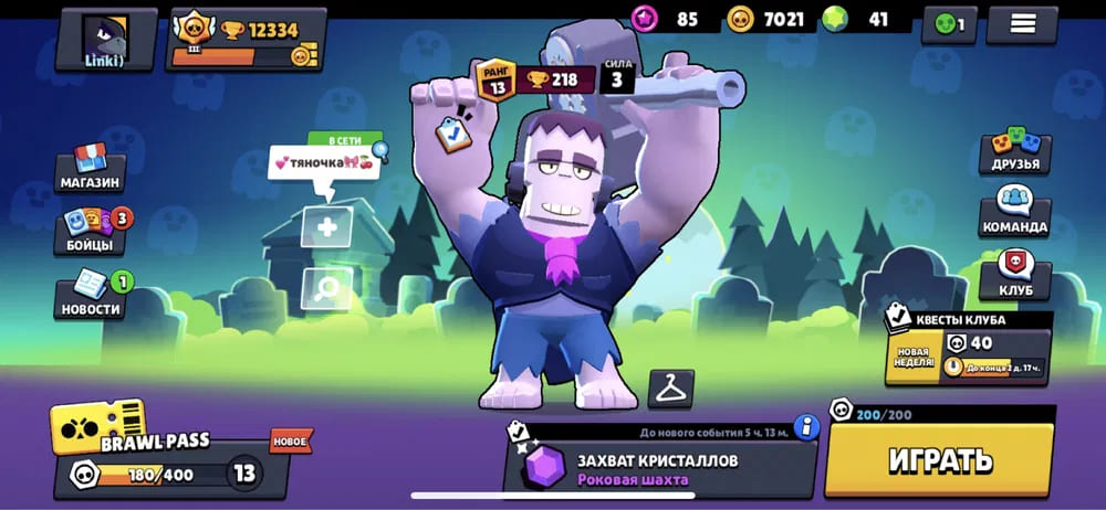 🏆Кубков: 12334; ⭐Уровень: 83; 💪Бойцов: 41/72; ⚡Леги: Ворон;