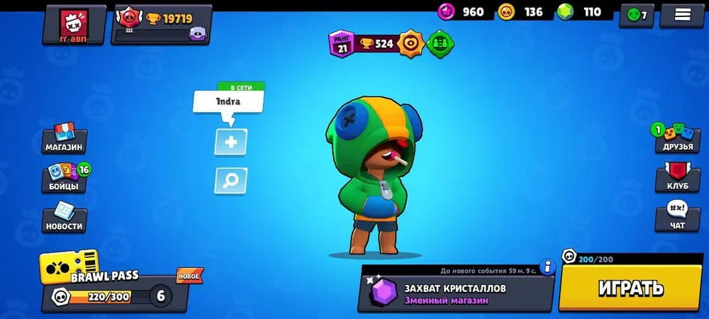 🏆Кубков: 19719; ⭐Уровень: 145; 💪Бойцов: 39/72; ⚡Леги: Леон, Спайк, Сэнди;