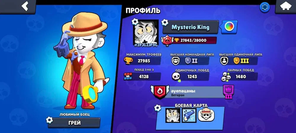 🏆Кубков: 27843; ⭐Уровень: 225; 💪Бойцов: 57/72; ⚡Леги: Леон, Спайк, Амбер, Ворон, Сэнди, Честер;