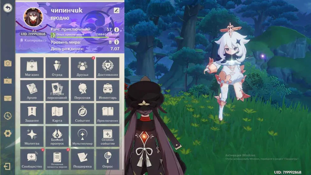 📈 Ранг: 57 🧍♀️ Персонажи: Странник, Ху Тао, Сяо, Шэнь Хэ, Райден, Ёимия, Аяка, Гань Юй, Венти, Мона, Дилюк, Ци Ци и другие ✨ Примогемы: 4000