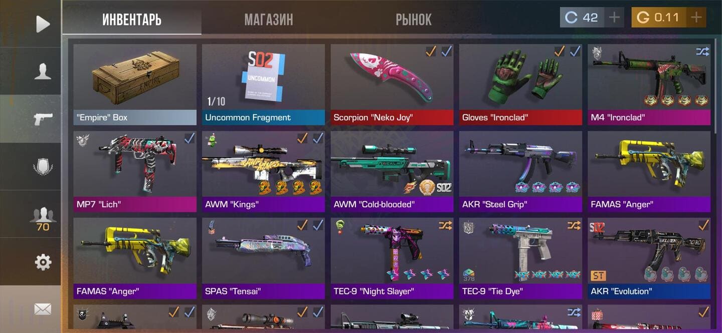 💰Голда: 0.11; 🧤Перчатки: 1; 🔪Ножи: 1; ⭐️Редкие скины: 3