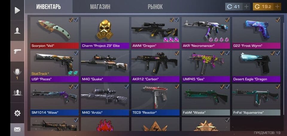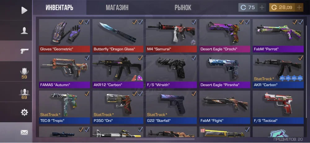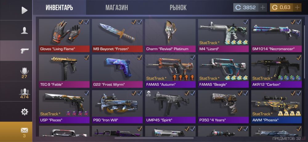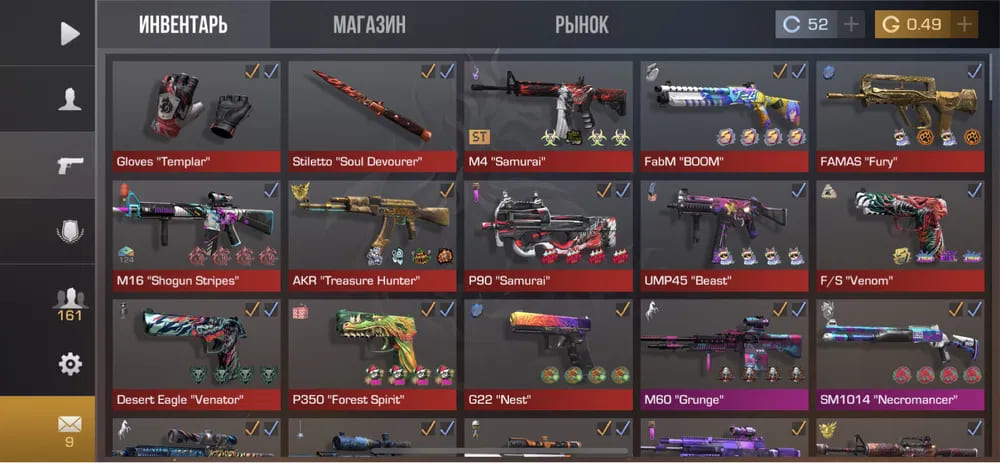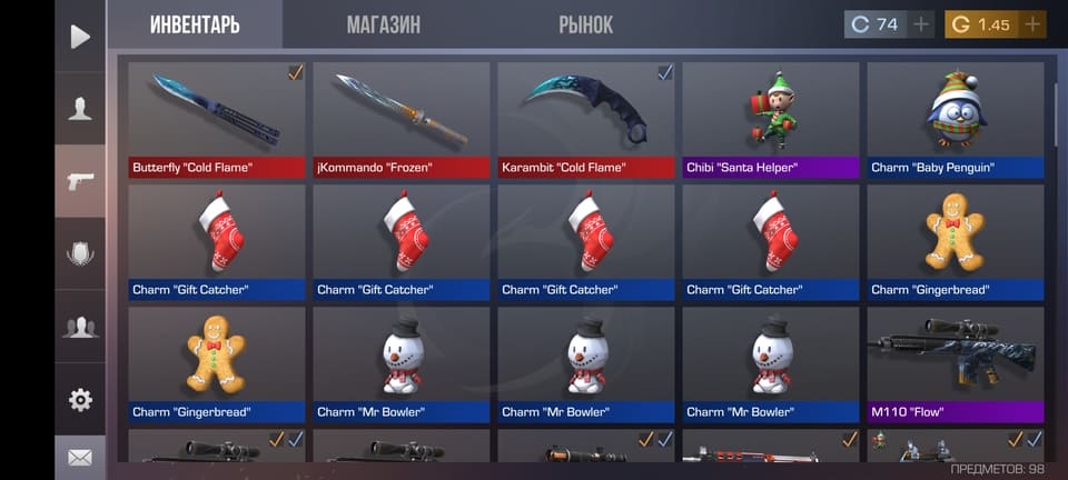 💰Голда: 15.27; 🧤Перчатки: 2 🔪Ножи: 2; ⭐️Редкие скины: 9