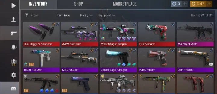 💰Голда: 0,47;🔪Ножи: 1;⭐️Редкие скины: 4