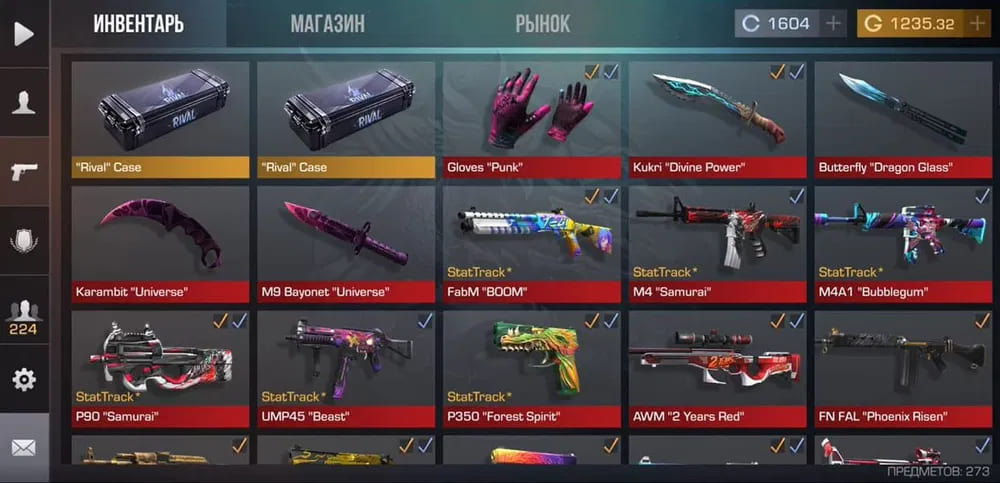💰Голда: 1235,32; 🔪Ножи: 4; ⭐️Редкие скины: 16